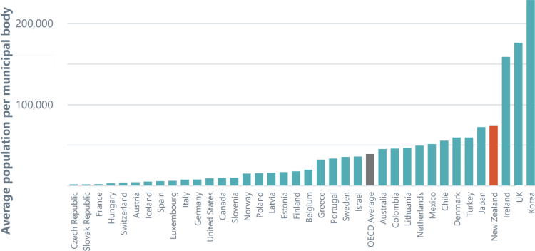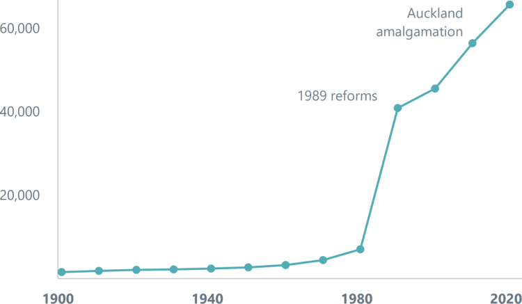 Source: Te Waihanga, with data from Ihimaera-Smiler 2014; Statistics NZ 2022NZ's local governments are consolidated by OECD standards