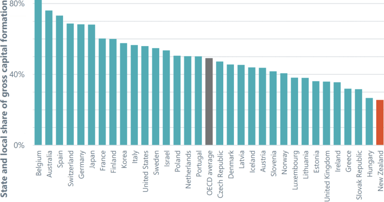 Click to view The subnational government share of total government gross capital formation shows the relationship between consolidation and fragmentation among OECD countries, revealing that New Zealand has highly centralised public infrastructure provision and a low level of local government fragmentation. Source: OECD 2019.Neither of these are new findings – the New Zealand Initiative released reports reaching similar conclusions almost a decade ago. But truth that is far from common knowledge bears repeating.