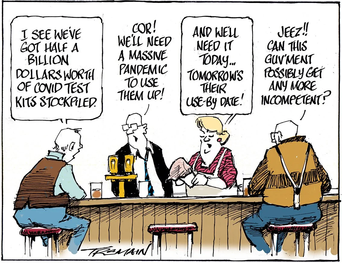 Here is Garrick Tremain's cartoon commentary on stockpiled covid test kits!