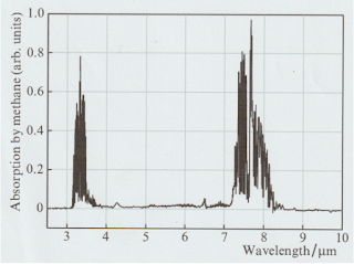 It is found that “greenhouse” gases do not absorb all the radiation falling on them. They only absorb radiation of certain wavelengths. In the case of Methane it only absorbs radiation in two narrow bands centred on 3.5 microns and 8 microns. This means that those two wavelengths are not detected by the spectrometer. There are dark lines in the spectrometer in these places, because the Methane has absorbed the radiation in those two wavelengths. A micron is a wavelength of a millionth of a metre. The graph below gives the absorption spectra of greenhouse gases. In other words, the graph gives the wavelengths of the Infra Red radiation (heat), from the Earth, that the molecules of that gas will absorb. I have drawn vertical lines though the peaks of Methane. The two absorption wavelength bands for Methane are the red blips.