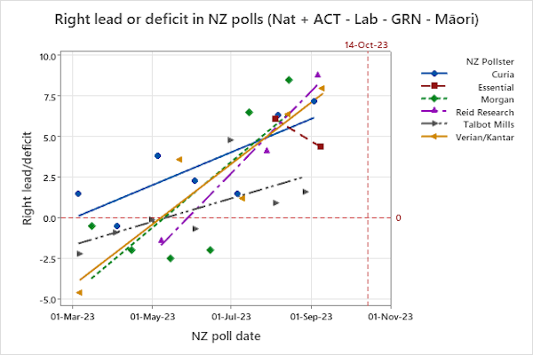 The graph below shows the right coalition’s lead or deficit over the left coalition in all New Zealand pollsters that have released at least two polls since March. The right coalition consists of National and ACT, while the left coalition consists of Labour, the Greens and Māori.