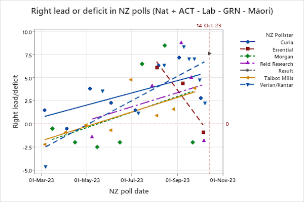 Right coalition minus left coalition support in NZ polls since March 2023. This is calculated as National plus ACT (right) minus all of Labour, Greens and Māori (left).