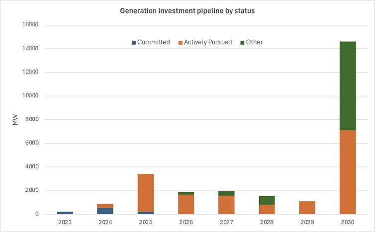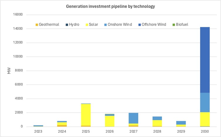 Committed and actively pursued projects will double generation capacity by the end of the decade. This will come largely from solar (6.4GW) and onshore wind (2.9GW), with smaller contributions from geothermal (0.6GW) and grid-scale batteries (0.6GW).