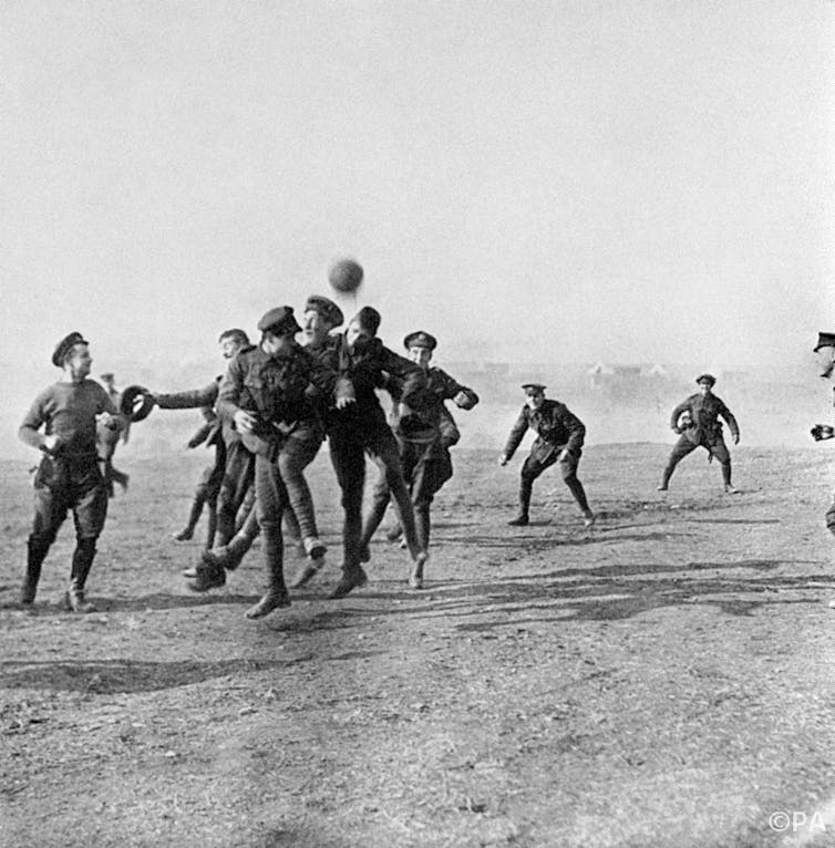 Soldiers playing a game of football a year later on Christmas Day, 1915. PA/PA Wire