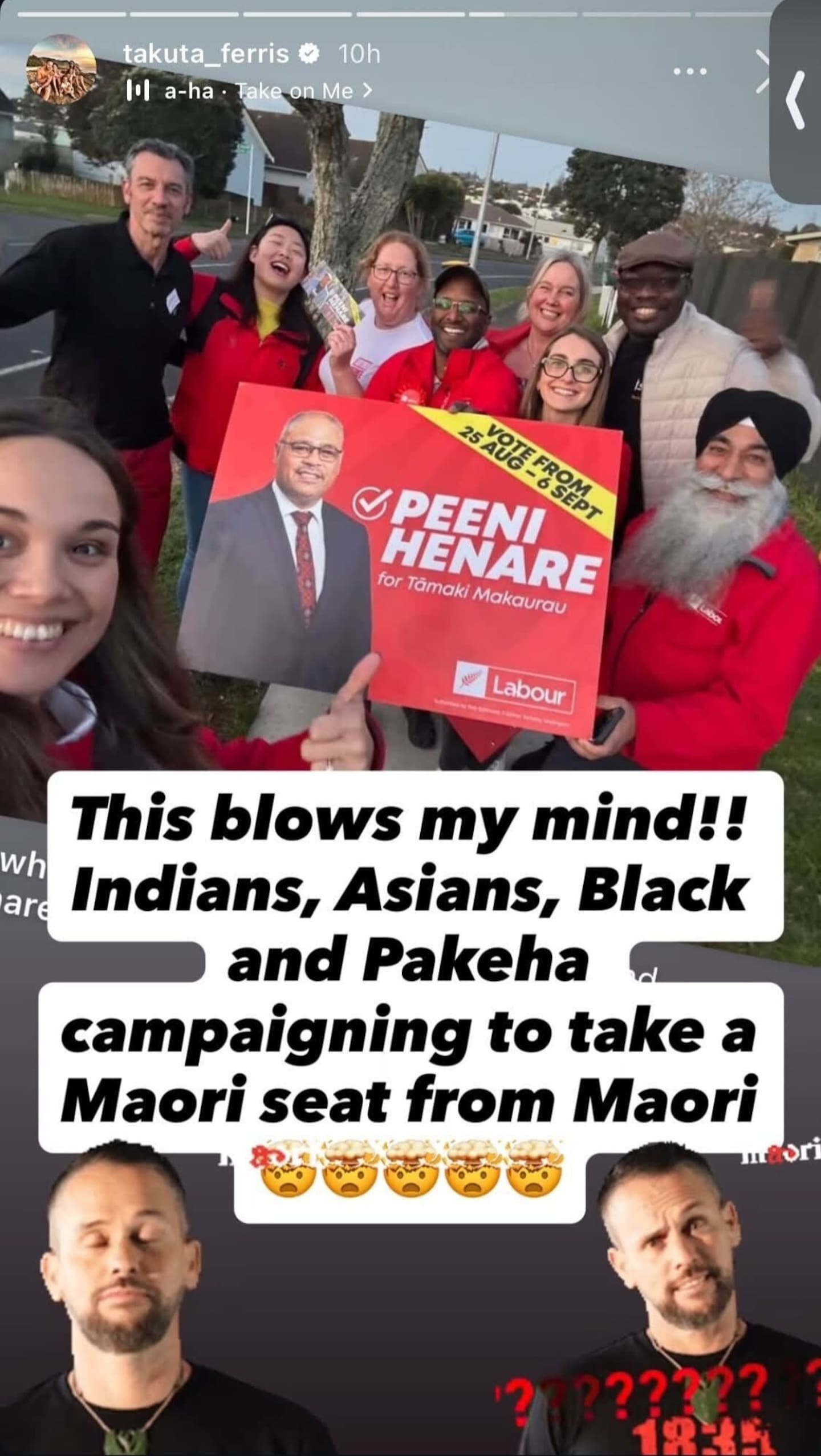 Te Pāti Māori MP Tākuta Ferris shared an Instagram story this week, featuring a photo of Labour’s Arena Williams and volunteers of diverse ethnicities. Ferris captioned it: "This blows my mind", followed by, “Indians, Asians, Black and Pakeha campaigning to take a Māori seat from Māori.”