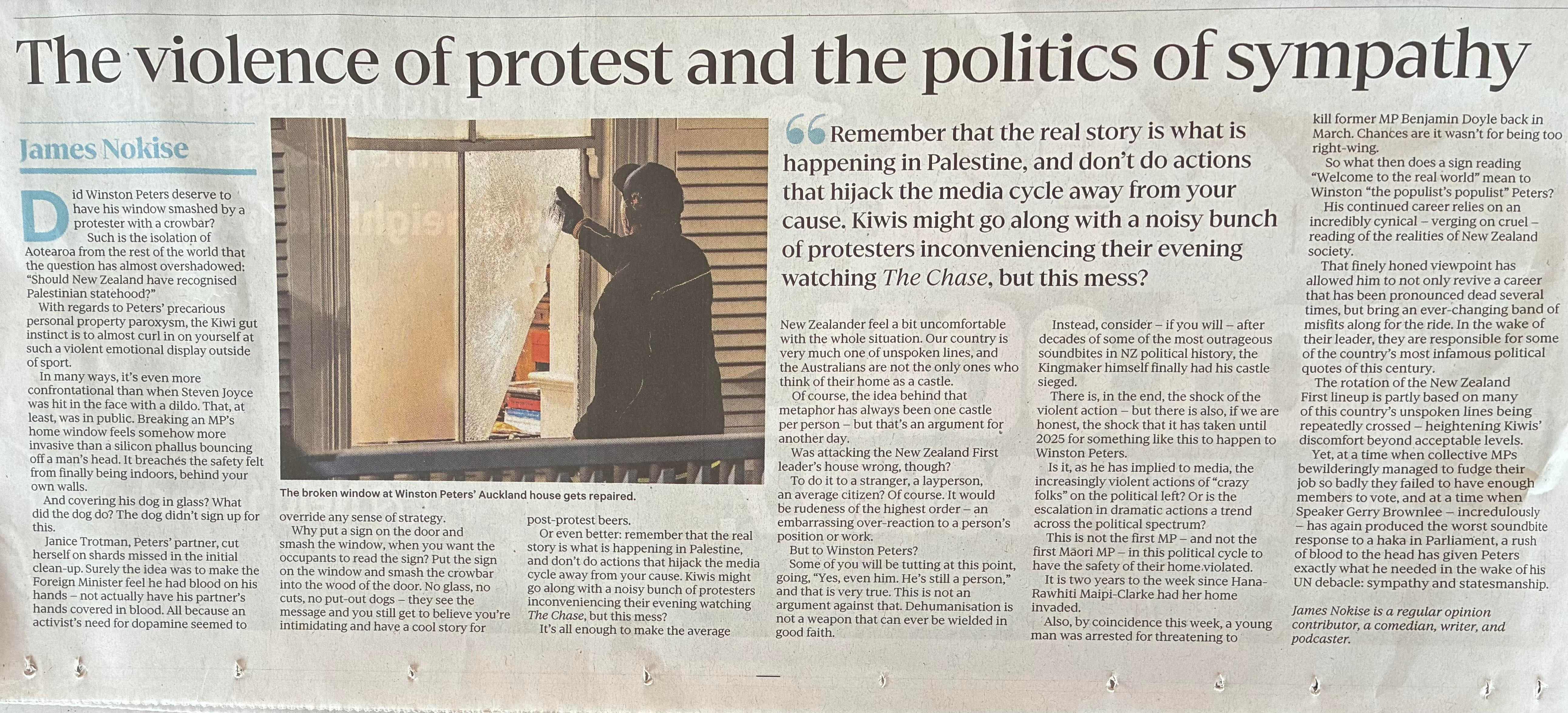 James’ piece begins “Did Winston Peters deserve to have his window smashed by a protester with a crowbar?”. In James’ opinion, the answer to that question is a resounding…YES. Peters got his just deserts, according to James, simply because, in his capacity as Minister of Foreign Affairs, Peters was the one to announce that the New Zealand Government is not (yet) prepared to recognise a Palestinian State. Nokise’s polemic includes the following: