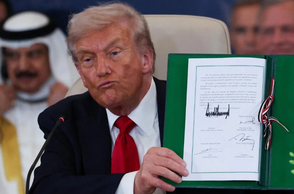 The Trump led peace deal, fragile and vague as it is. Of note, neither Israel or Hamas were part of this summit and agreement.