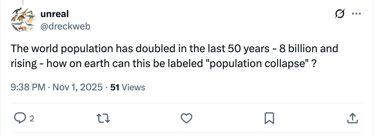 I want to be clear that this piece isn’t about prescribing solutions. It’s about defining the problem clearly, soberly, and without political filters. Before anyone can meaningfully debate how to respond to population collapse, we have to understand what it is, what drives it, and what it means for the kind of societies we want to build. Too often, the conversation jumps straight to ideology, like arguments about women’s choices, immigration, or the environment, without ever acknowledging the underlying arithmetic.