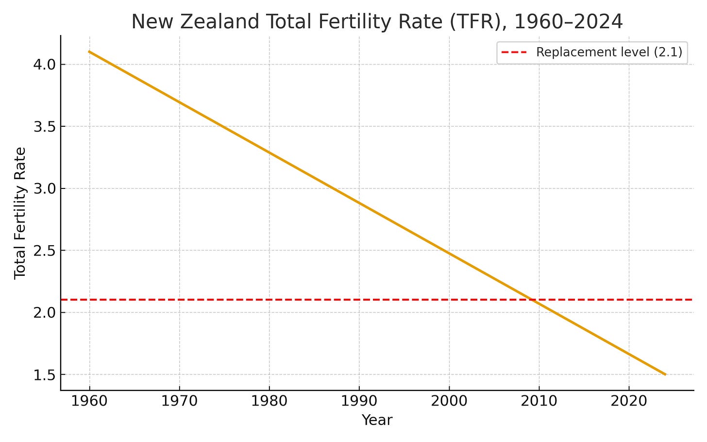 - NZ Treasury Analytical Note 24/08 on the fertility slide to ~1.53 in year to June 2024.