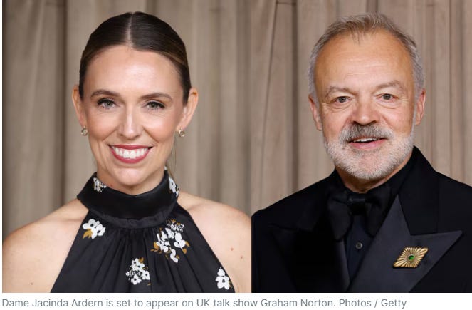 The next leg of Ardern’s escalating charm offensive will be her appearance on The Graham Norton Show, which will air in the UK on Friday, 5 December 2025. Jacinda will be joined by Kate Winslet, Alan Carr, and Seth Meyers. The episode will air in New Zealand on TVNZ on 12 December 2025. Her Graham Norton appearance is curated to coincide with the 5 December UK release of her autobiographical documentary, Prime Minister.