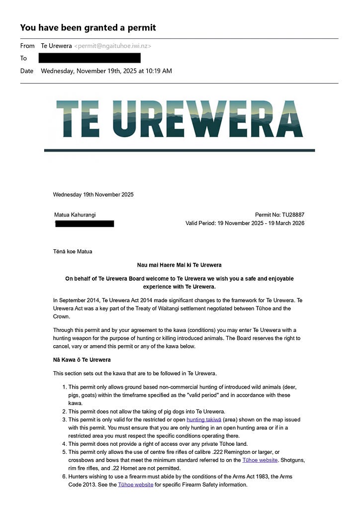 I wanted to see how easy it really was to get a hunting permit, and sure enough, it was pretty straightforward. I went onto the Te Uru Taumatua website, filled out the application, and was sent the permit straight away, no questions asked. The only requirement is to carry it with you at all times while hunting. The process is very similar to getting a standard hunting permit from DOC.