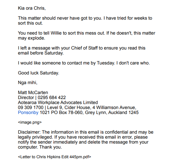 “I then wrote to Chris Hipkins outlining the full story and requesting he tell Willie to just sort the matter out. I was informed he did read the letter, but then went to ground. Good grief. Labour’s chief whip later claimed a Labour member of parliament brazenly using their power to cover up bullying of employees was not a matter for the party to be involved. Unbelievable! A case could be made the Privileges Committee should hold the Leader and the chief whip accountable for their actions in covering up the abuse. I have attached the correspondence with the Labour Leader’s office.”