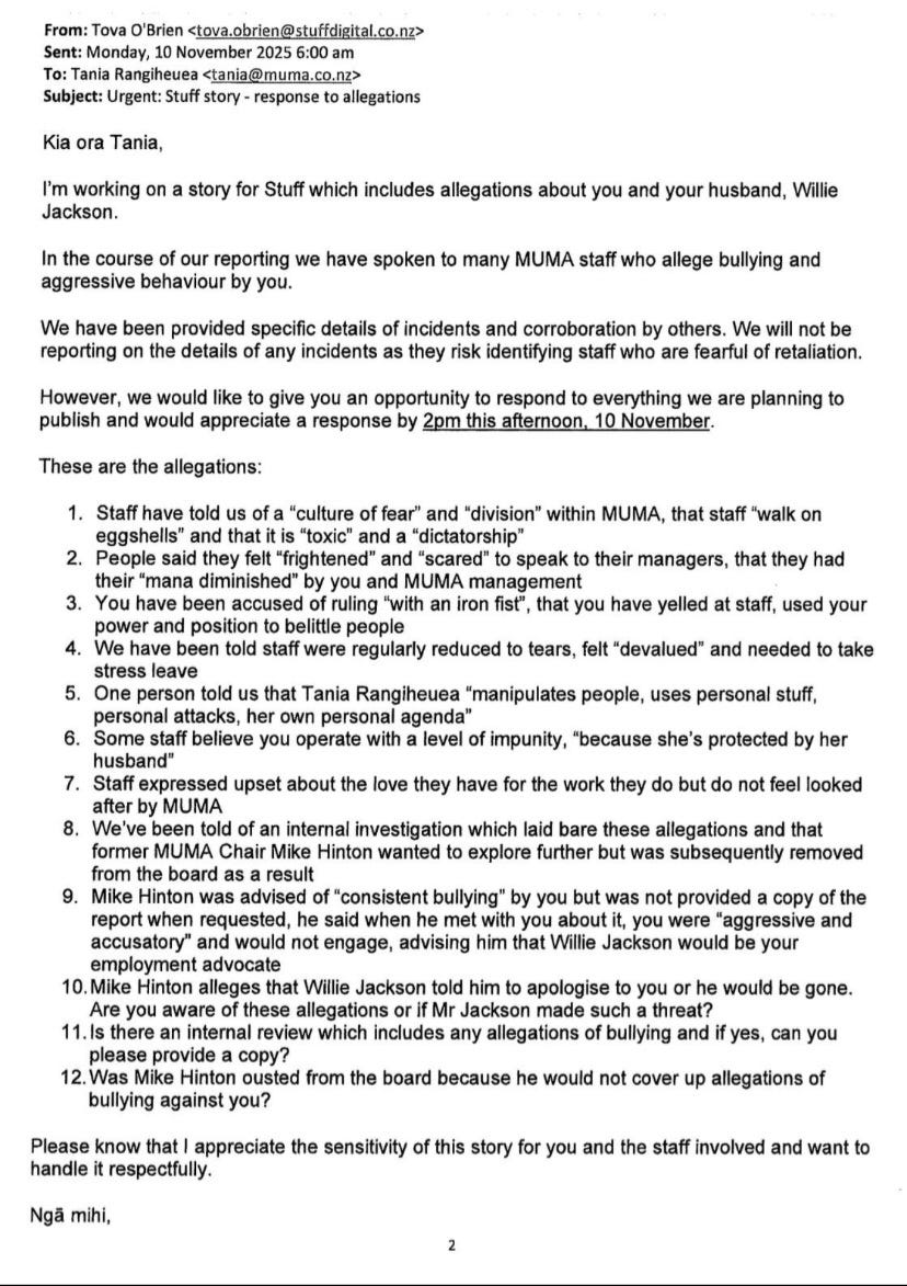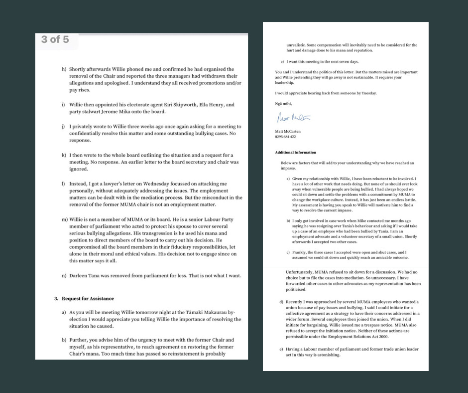 On 20 August 2025, McCarten wrote directly to the MUMA Board. His detailed letter is an exhaustive, ten-page account outlining serious allegations of bullying, dysfunction, retaliatory behaviour, and political interference within the organisation. He begins by stressing that the situation has become “untenable” and cannot be ignored any longer, noting that earlier attempts at informal resolution were repeatedly dismissed. McCarten describes multiple cases of alleged bullying by CEO Tania Rangiheuea, employees being humiliated, underpaid, pushed to tears, threatened, or subjected to retaliatory disciplinary processes. He also details systemic issues: opaque pay scales, favouritism, erratic HR practices, and widespread fear among staff.