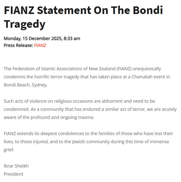 The Bondi Beach massacre was executed by a Muslim father-and-son duo, Sajid Akram (shot dead by Police) and his son Naveed (shot, but still alive). In response to the carnage, the Federation of Islamic Associations of New Zealand (FIANZ) has issued the following press release: