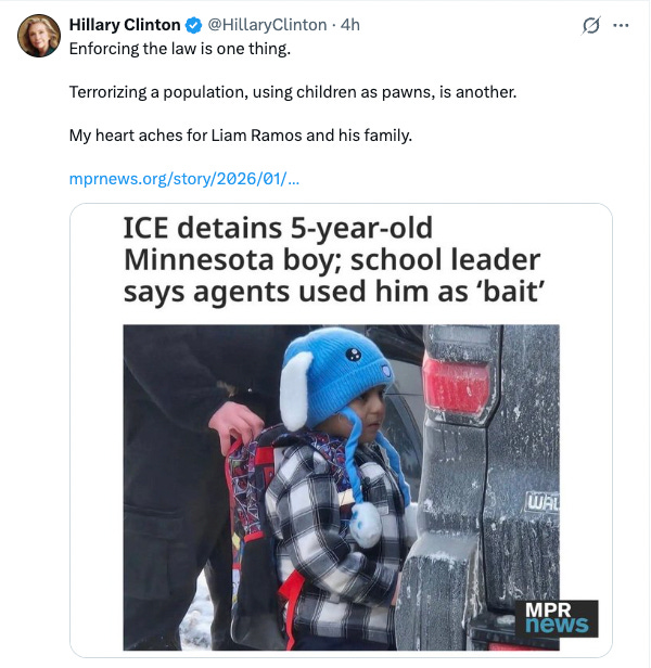 And yet, now, in January 2026, Clinton joined a coordinated campaign accusing ICE of “terrorising a population” and “using children as pawns” following an arrest in Minneapolis, despite the factual record directly contradicting that claim.