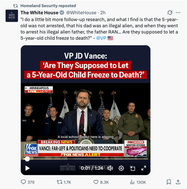 This has been stated and reiterated multiple times by both DHS and ICE. There have been no shifting narratives, retractions, or deflection. Nor has there been any contradictory evidence produced. No body-cam footage has emerged showing a child being “used as bait.”
