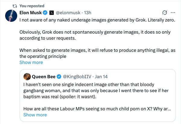 RNZ can’t decide if the story is “X did nothing” or “X reacted but imperfectly.” It also pretends that paid subscribers are able to produce illegal content, because that is what nude content is. As Musk says below, Grok “will refuse to produce anything illegal”.