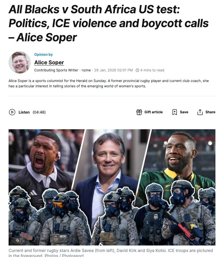 Placing two tragic deaths involving ICE adjacent to a rugby fixture announcement and causally linking them by proximity on the news cycle is opportunistic and disingenuous. An exciting event for American and Kiwi fans has now been turned into a symbolic battleground. Players are even being urged to be fearful as though ICE is going to storm the field to whack cuffs on Ardie Savea as he staggers up from a ruck.