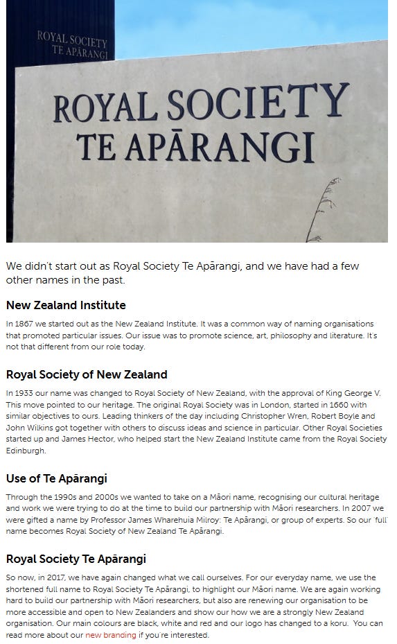 In 2021, a year after starting as President of the Law Commission, Amokura Kawharu was elected to the Royal Society of New Zealand. As with the Law Commission, the Royal Society calls itself by a name that’s not its real name - Royal Society Te Apārangi. The Royal Society claims that “Te Apārangi” was gifted to it in 2007 by someone by the name of Professor James Wharehuia Milroy. Quite why James felt entitled to gift those words to the Royal Society, or why the Royal Society thought James had that entitlement, is anybody’s guess. Madness.