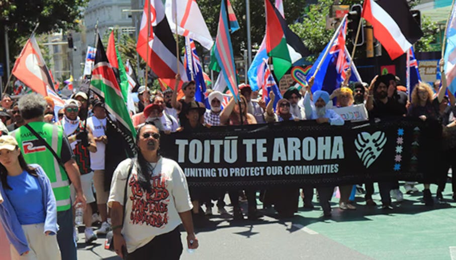 Returning to New Zealand, we also had this weekend a protest by a group calling themselves Toitu te Aroha. It is hard to know where to begin with the glaring inconsistencies here. First up was all the talk of aroha or love, and yet so many of the slogans, signs, and messages were those of violence, anger, and aggression. After this, one must question the internal inconsistencies as this umbrella group embraces radical Islamists and trans right activists, human rights activists and those vocally supporting the Iranian or Venezuelan despots.