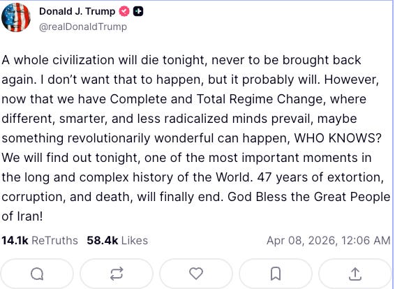 His recent statements in which he threatens to dismantle Iran’s infrastructure and warns of consequences severe enough to cripple the country are not aberrations in this sense. They are consistent with a worldview that prioritises coercion over negotiation. The two week ceasefire is not the product of careful diplomacy or mutual concession, but of an ultimatum: reopen the “f**kin’ Strait” of Hormuz or face escalation. That it succeeded in the immediate term does not prove that it will succeed in the long term, but it does show that there is some logic to dealing with these adversaries in terms they understand: violence.