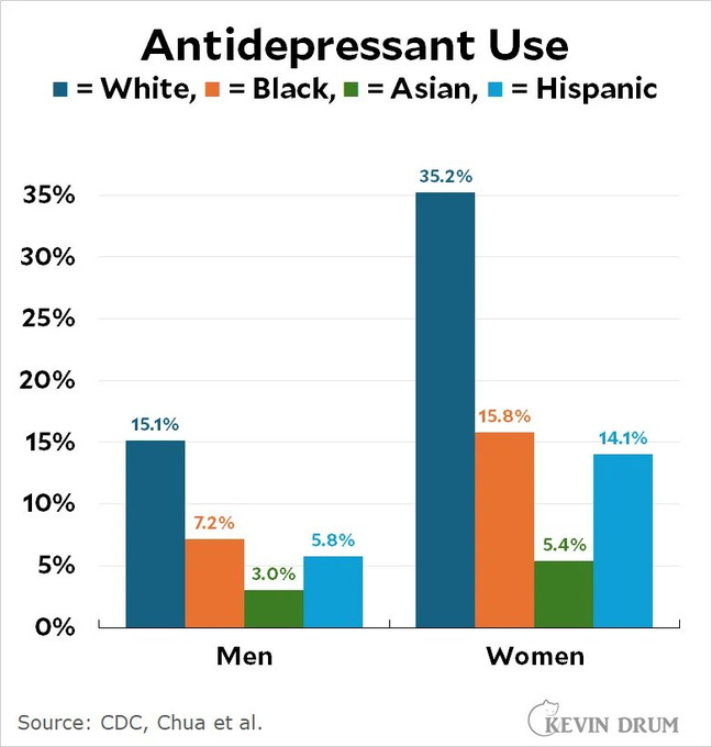 I stumbled across these two graphs while doom scrolling. I already knew there is disproportionate mental illness among females and those on the left, but I wasn’t aware of the racial skew.