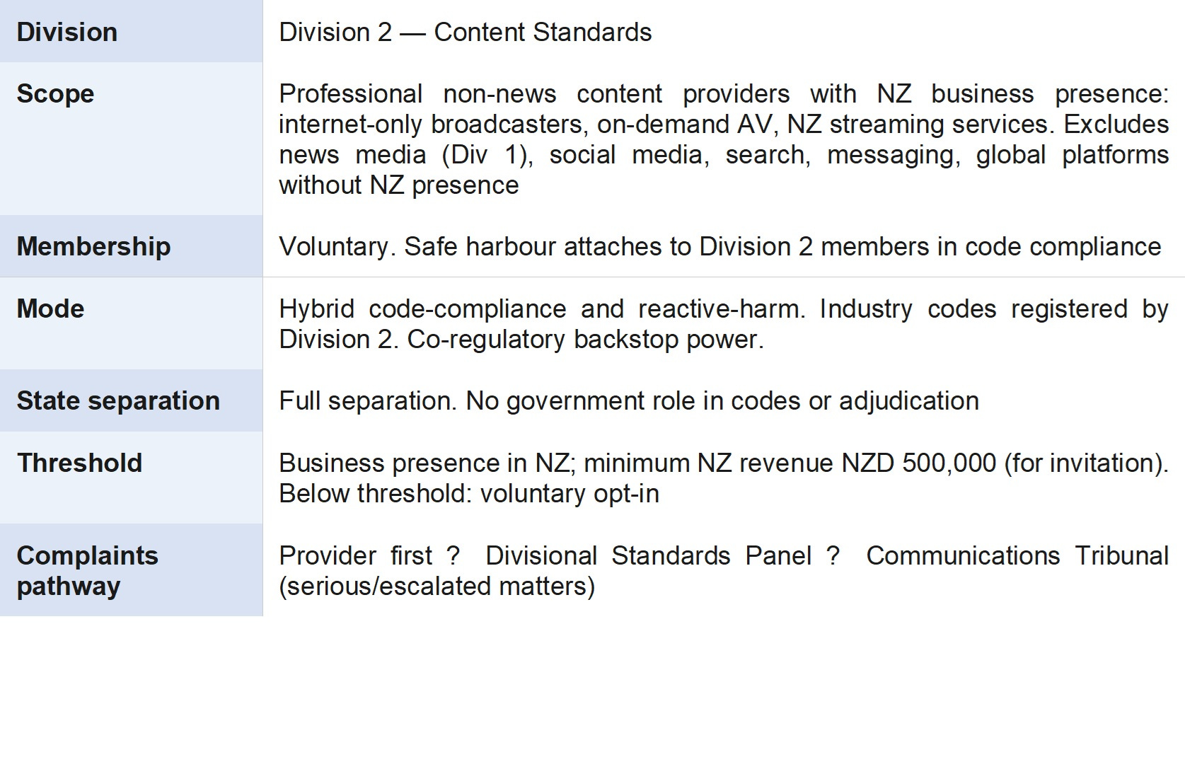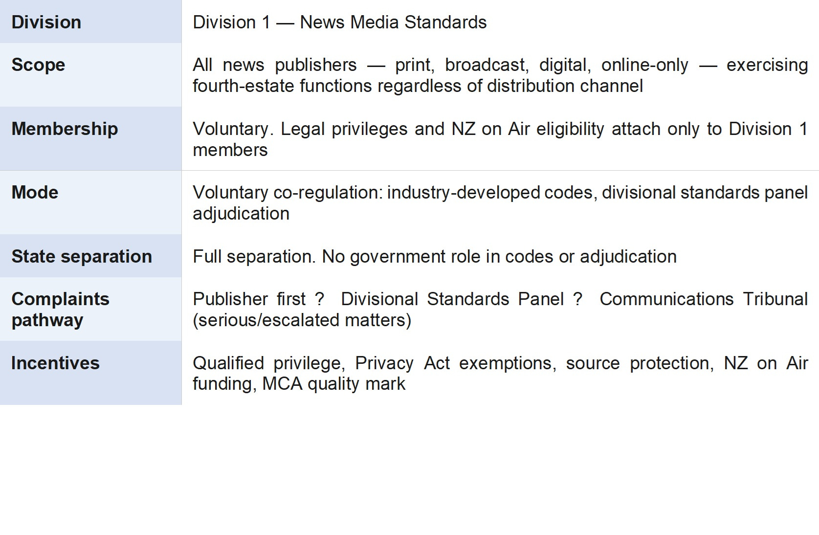 • New Zealand Media Council (continues; transition pathway to Division 1)