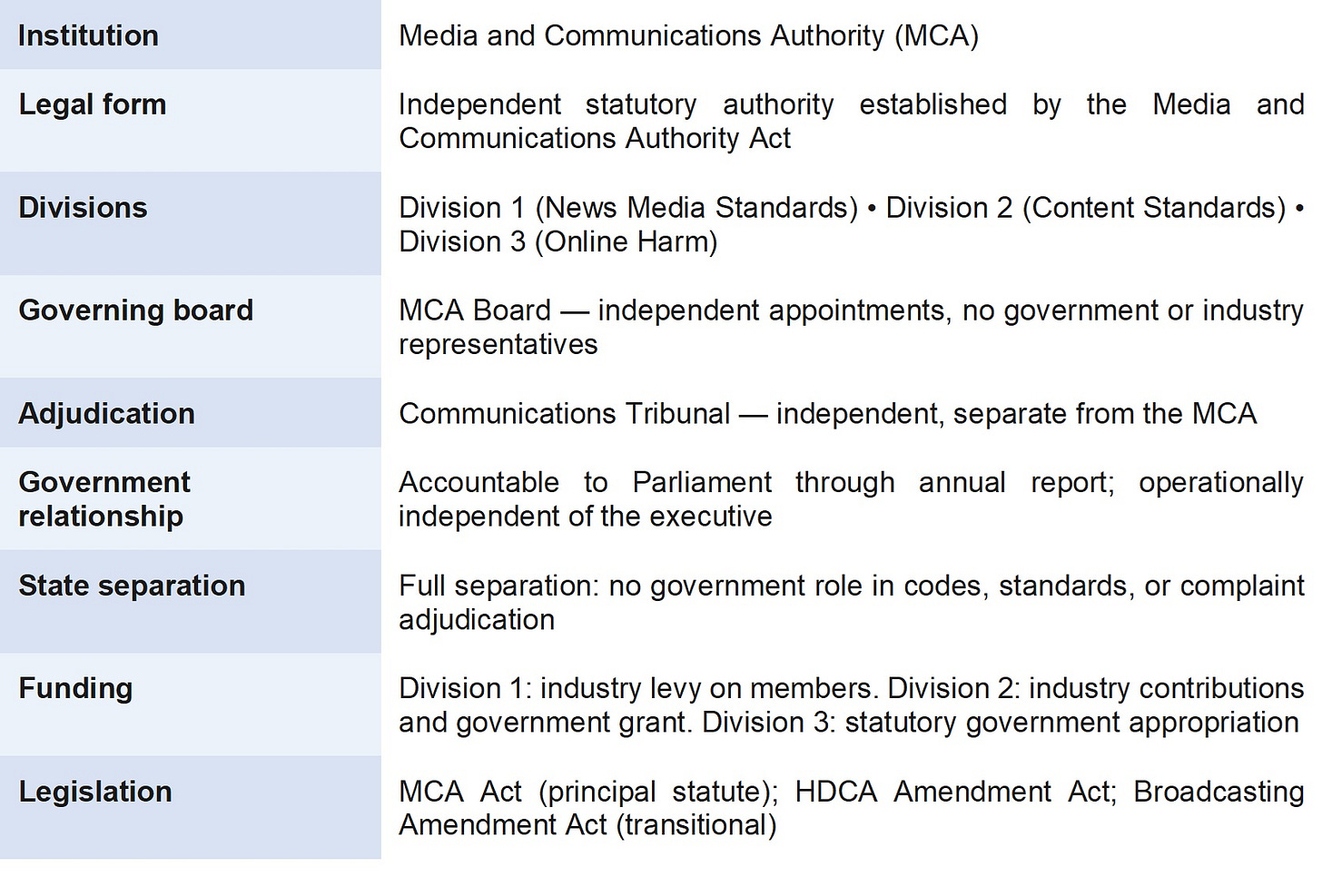 This proposal collapses the three distinct bodies that would otherwise be required into a single institution: the Media and Communications Authority (MCA). The Communications Tribunal is retained as an independent adjudicative body reporting to no part of the MCA. All substantive principles and rationales from the hybrid framework are preserved in full.