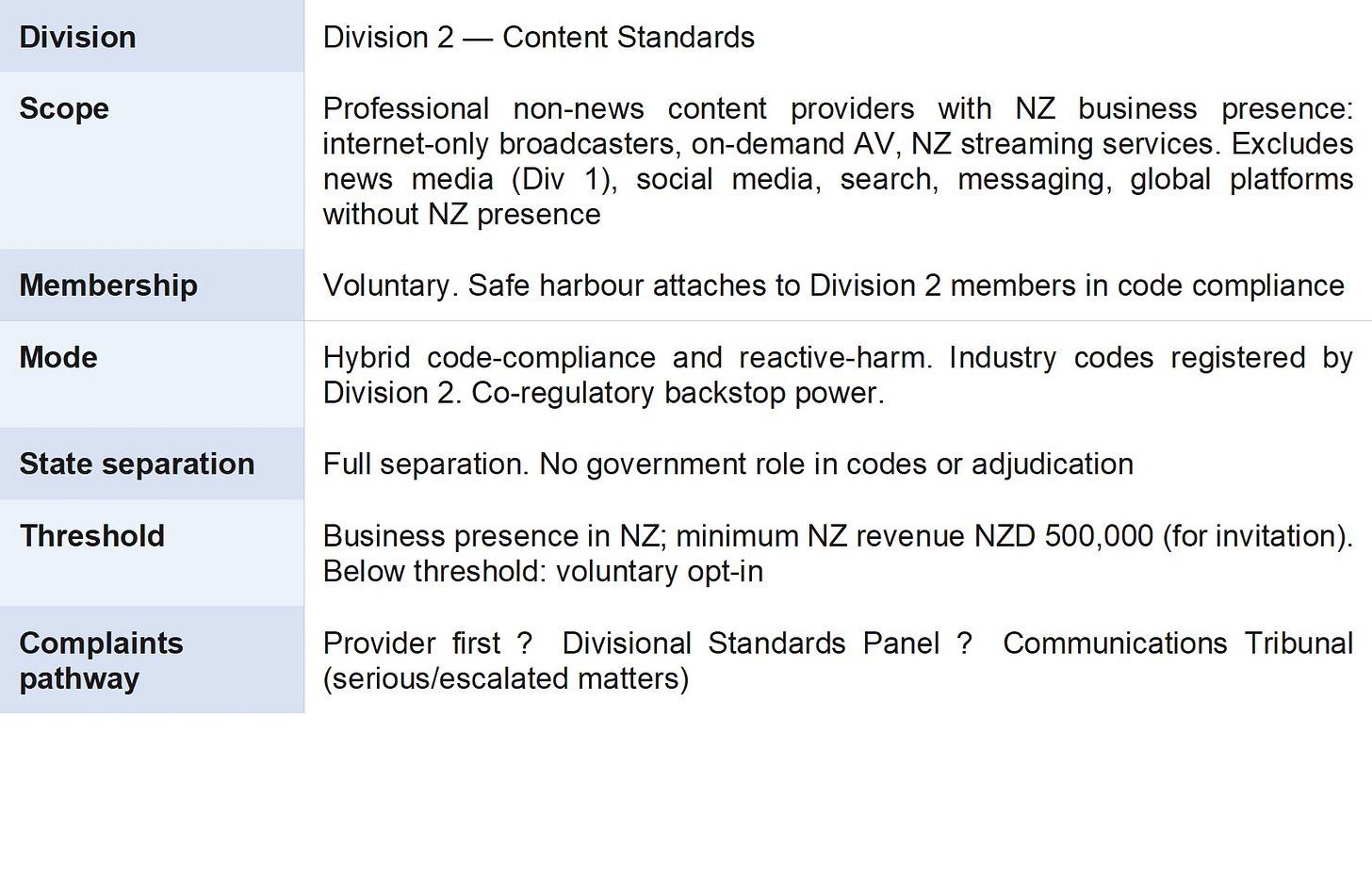 Each of these bodies was designed for a specific communications context, and each carries structural limitations when applied to the contemporary digital environment. The BSA’s jurisdiction expressly excludes on-demand content, which now constitutes the majority of audiovisual consumption. The NZMC operates on a voluntary basis with no enforcement powers. The HDCA was designed for interpersonal harmful communications, not for systemic platform regulation.