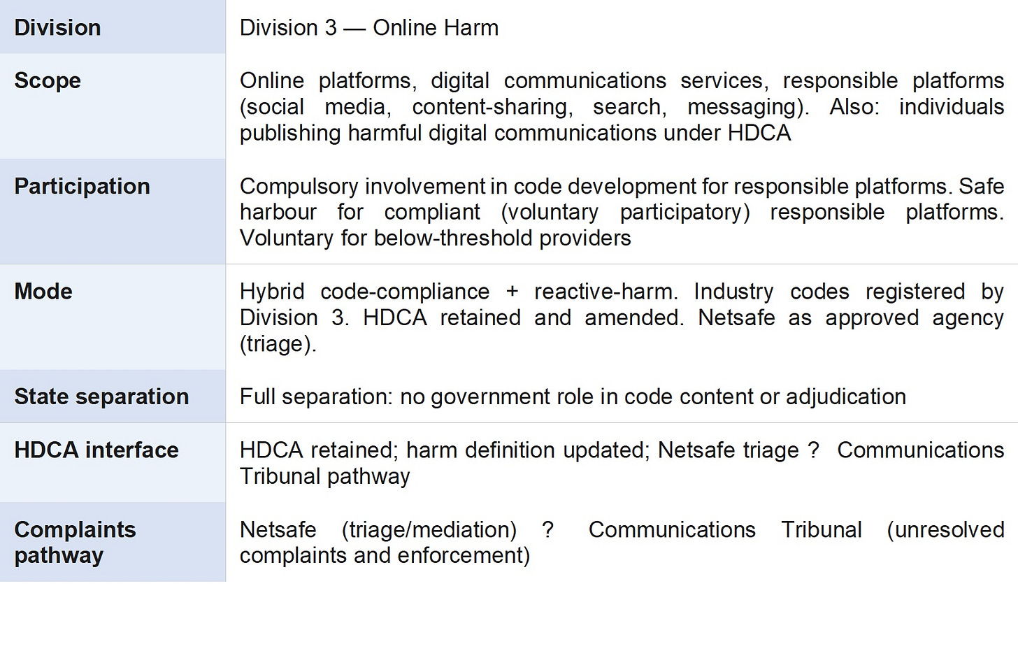 Division 3 is the operational unit of the MCA responsible for platform-level harm regulation. It combines the functions of the platform harm regulator with the governance and administrative infrastructure of the MCA. The substantive model — hybrid code-compliance and reactive-harm, incorporating and extending the Harmful Digital Communications Act 2015 — is as described in Part 3.