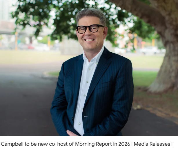 Speaking of which, John Campbell is scheduled to start as co-host of Radio New Zealand’s Morning Report programme on 13 April, replacing Corin Dann and joining Ingrid Hipkiss. Campbell has done nothing since his amorphous role as TVNZ’s “Chief Correspondent” ended before the end of 2025. I’ve covered John Campbell in previous Substacks: